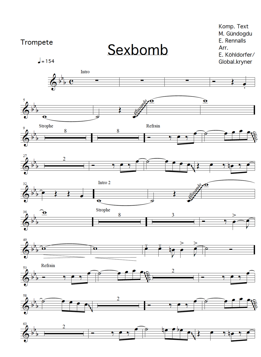 "Sex Bomb" as played by Global Kryner. Each package consists of 6 individual parts (vocals, trumpet, clarinet, accordion, guitar, trombone), lyrics, cover and the entire score!
