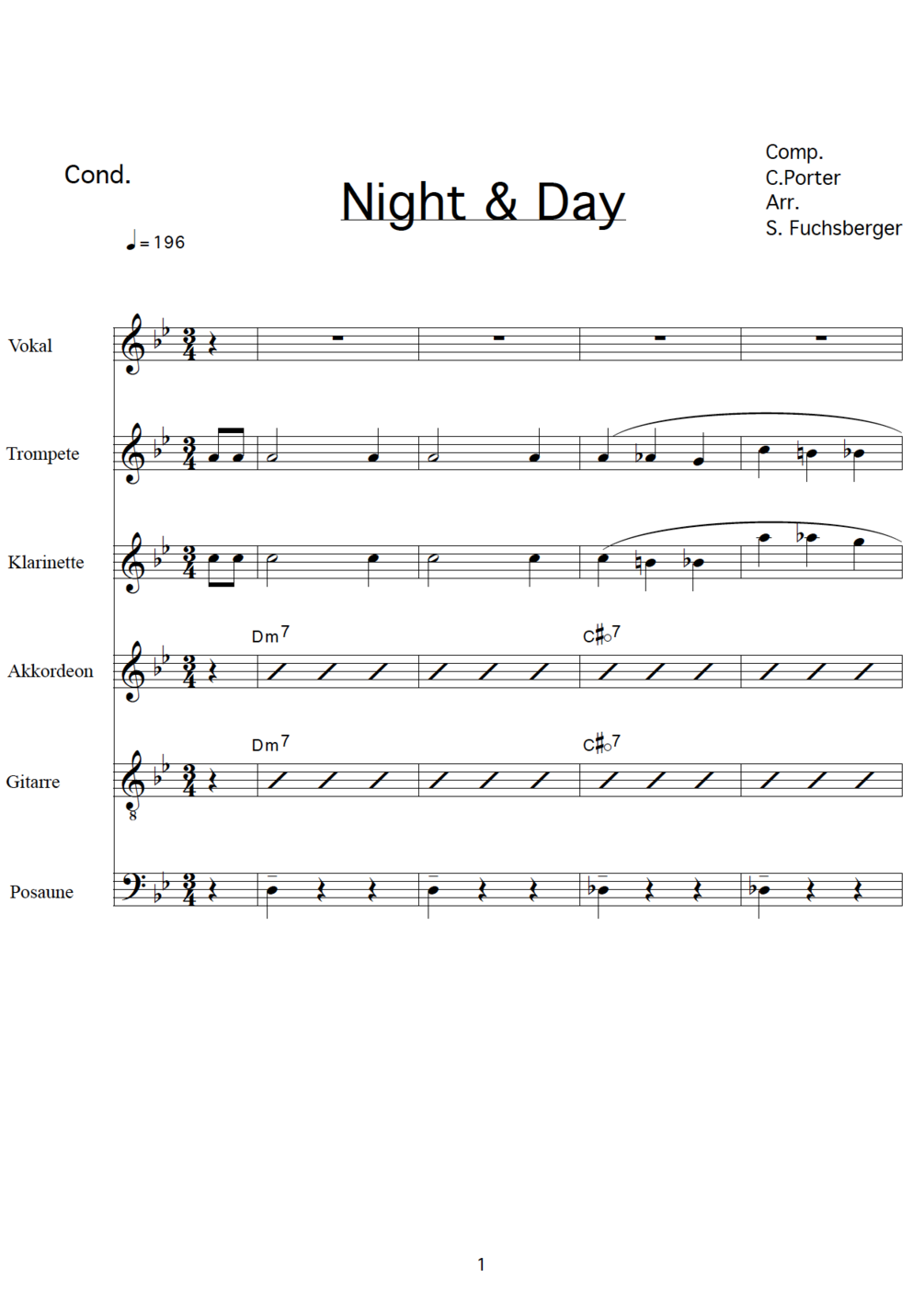 "Night and Day" as played by Global Kryner. Each package consists of 6 individual parts (vocals, trumpet, clarinet, accordion, guitar, trombone), lyrics, cover and the entire score!
