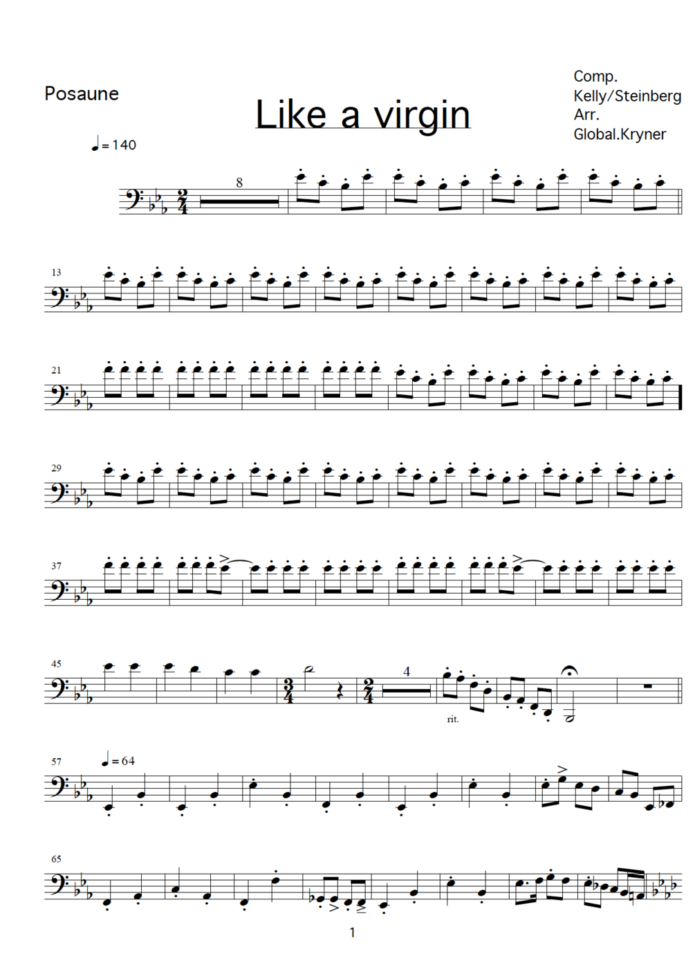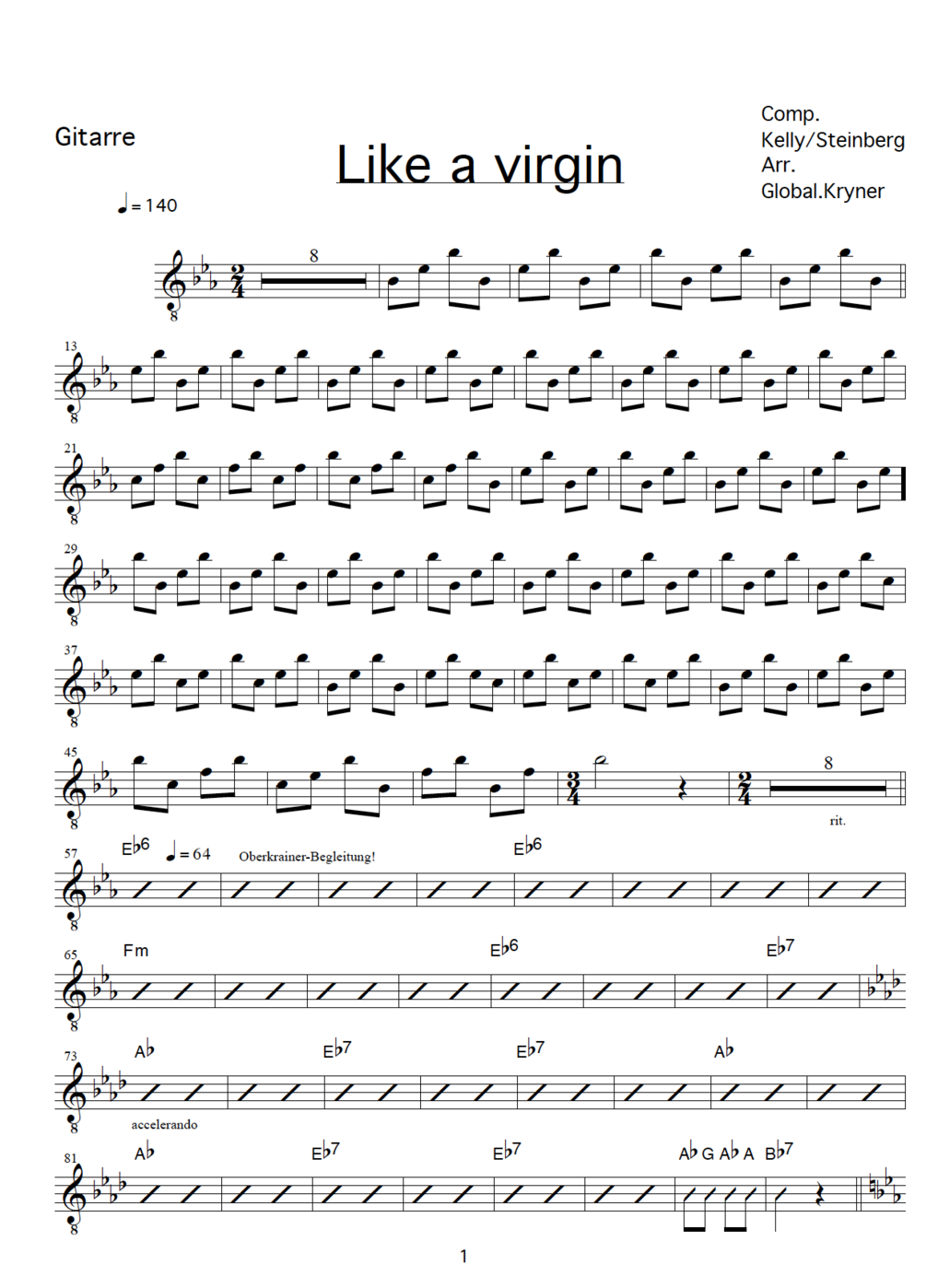 "Like a virgin" as played by Global Kryner. Each package consists of 6 individual parts (vocals, trumpet, clarinet, accordion, guitar, trombone), lyrics, cover and the entire score!