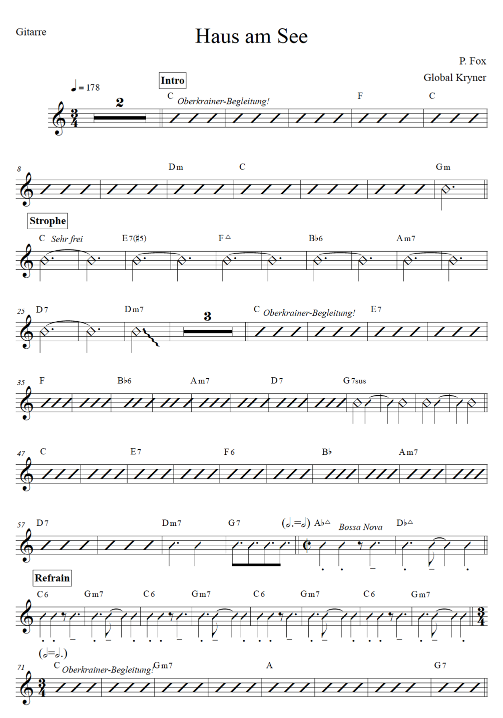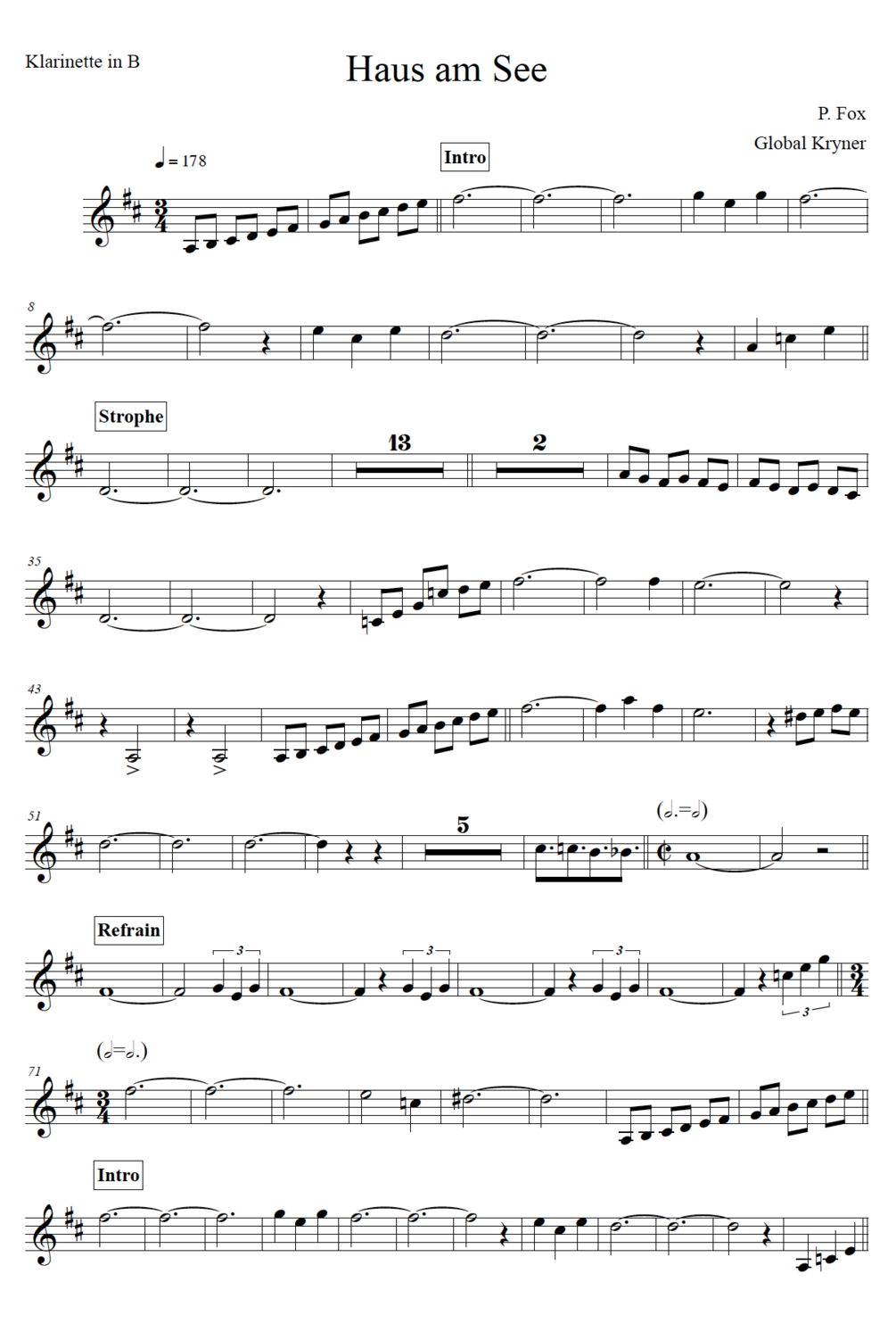 "Haus am See" as played by Global Kryner. Each package consists of 6 individual parts (vocals, trumpet, clarinet, accordion, guitar, trombone), lyrics, cover and the entire score!